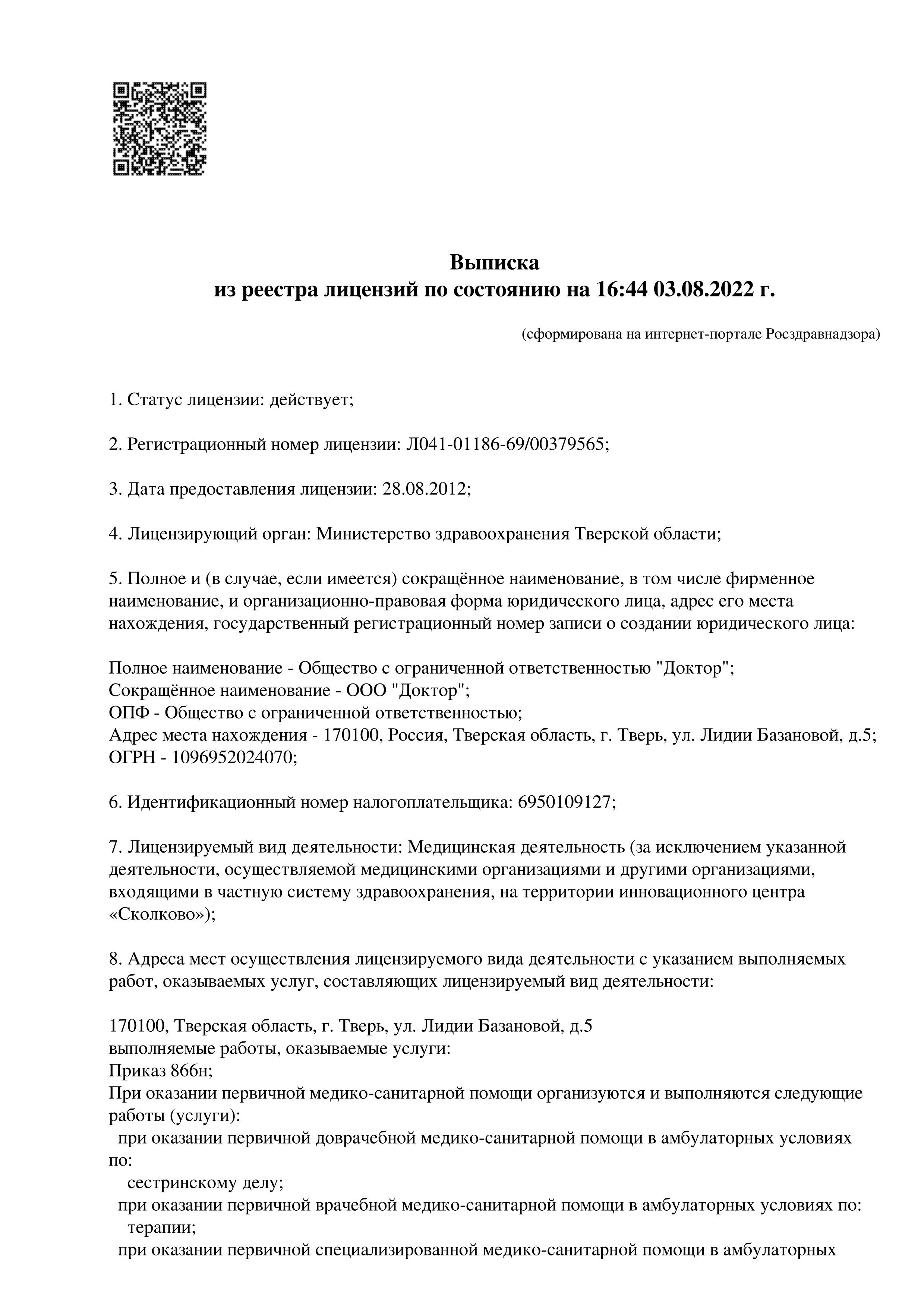 ООО "ДОКТОР" Лицензия № Л041-01186-69/00379565 от 28.08.2012 ОГРН 1096952024070